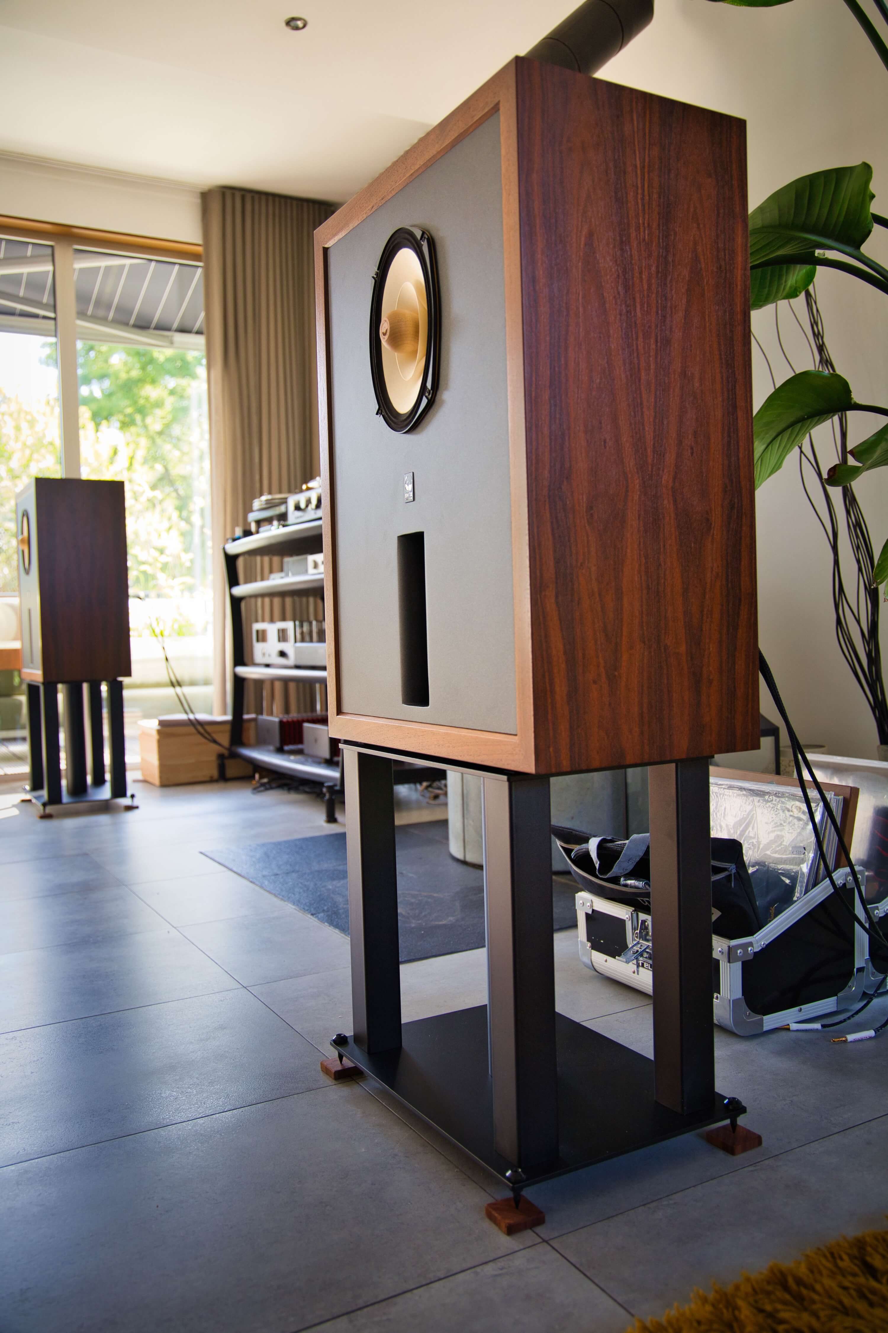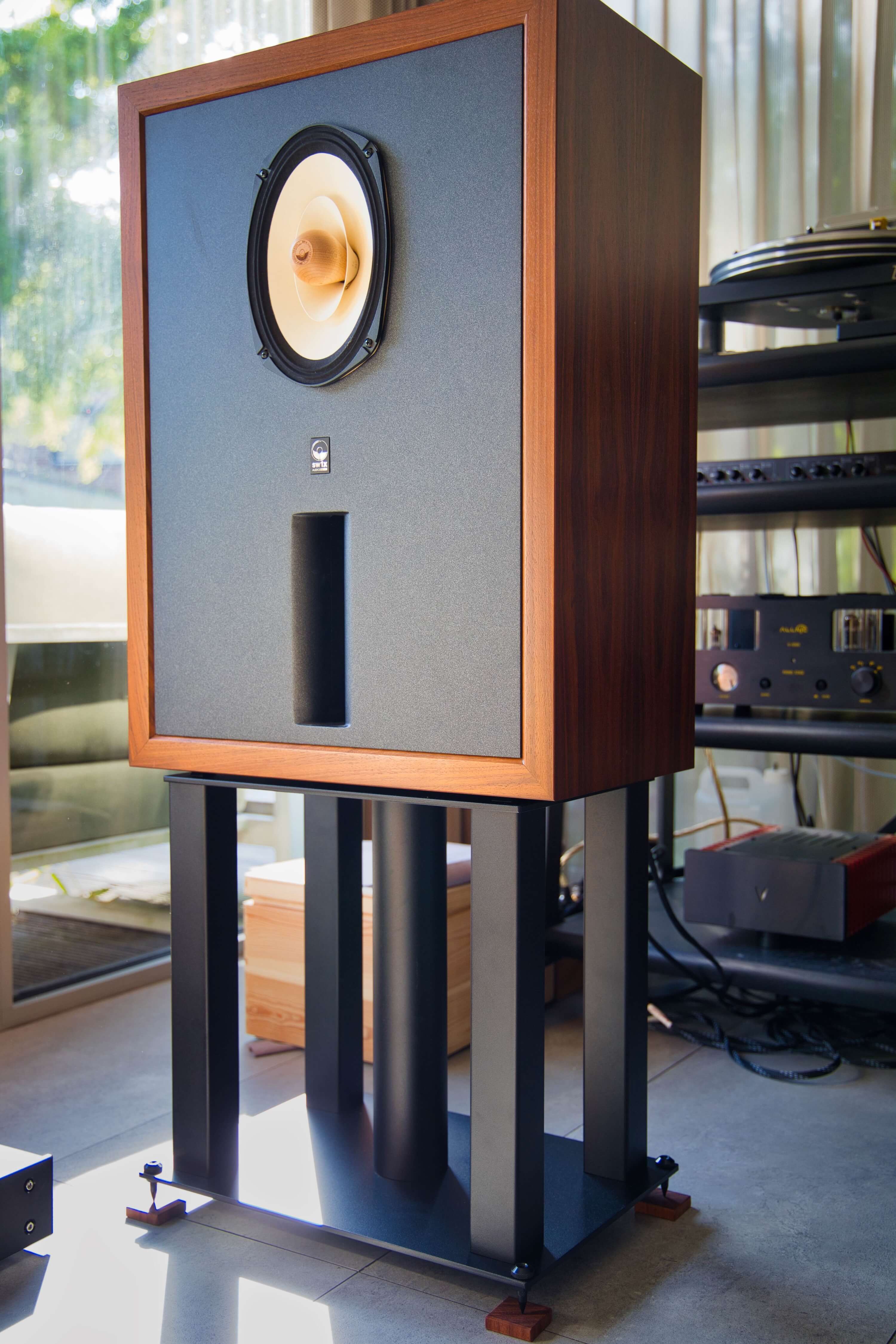 Enkele fullrange 3-in-1 (9″, 6″ en 3″ diameter) concentrische ovale drivers met papieren conussen, stoffen ophanging en massief houten faseplug.